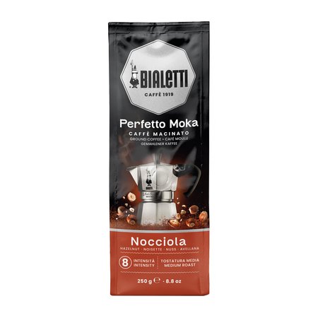 Bialetti Perfetto Moka Nocciola is Italian dark roast ground coffee. The blend consists of 80% Arabika from Colombia and 20% Robusta, with hazelnut flavouring and extract. Full-bodied, intense and sweet, with the highlighted notes of hazelnut. Due to the grind size, recommended for moka pots. Proper coarseness results in good water flow, desired extraction and finally expected flavour.